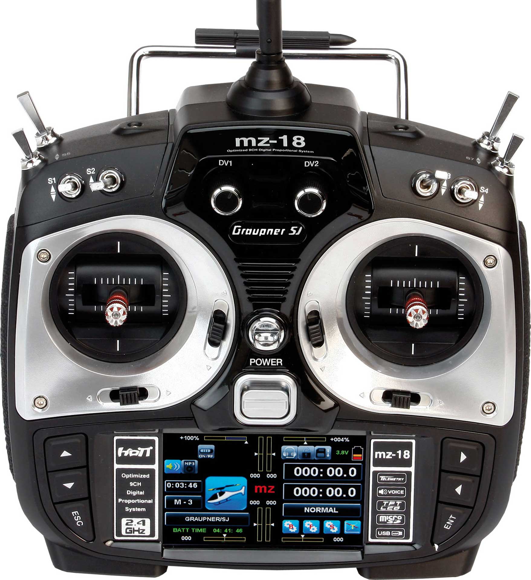 Die Graupner Fernsteuerung mz-18 mit 9 Kanälen ist der perfekte Sender für nahezu alle Flugmodelle. Der Sender eignet sich besonders für fortgeschrittene RC-Piloten. Die bewährte Graupner 2,4 GHz HoTT-Technologie garantiert störungs- und verzögerungsfreie Übertragung, auch über hohe Reichweiten. Die Graupner mz-18 verfügt über ein 3,5 TFT Farb-Touch-Display. Empfangene Telemetrie-Daten können so übersichtlich abgelesen und Programmierungen direkt am Sender vorgenommen werden. Als zusätzliche Sicherheit verfügt die mz-18 über eine intelligente Sprachausgabe - über Lautsprecher oder Kopfhörer. Diese gibt Telemetriedaten, Warnungen, Alarme und Vario-Signale durch.